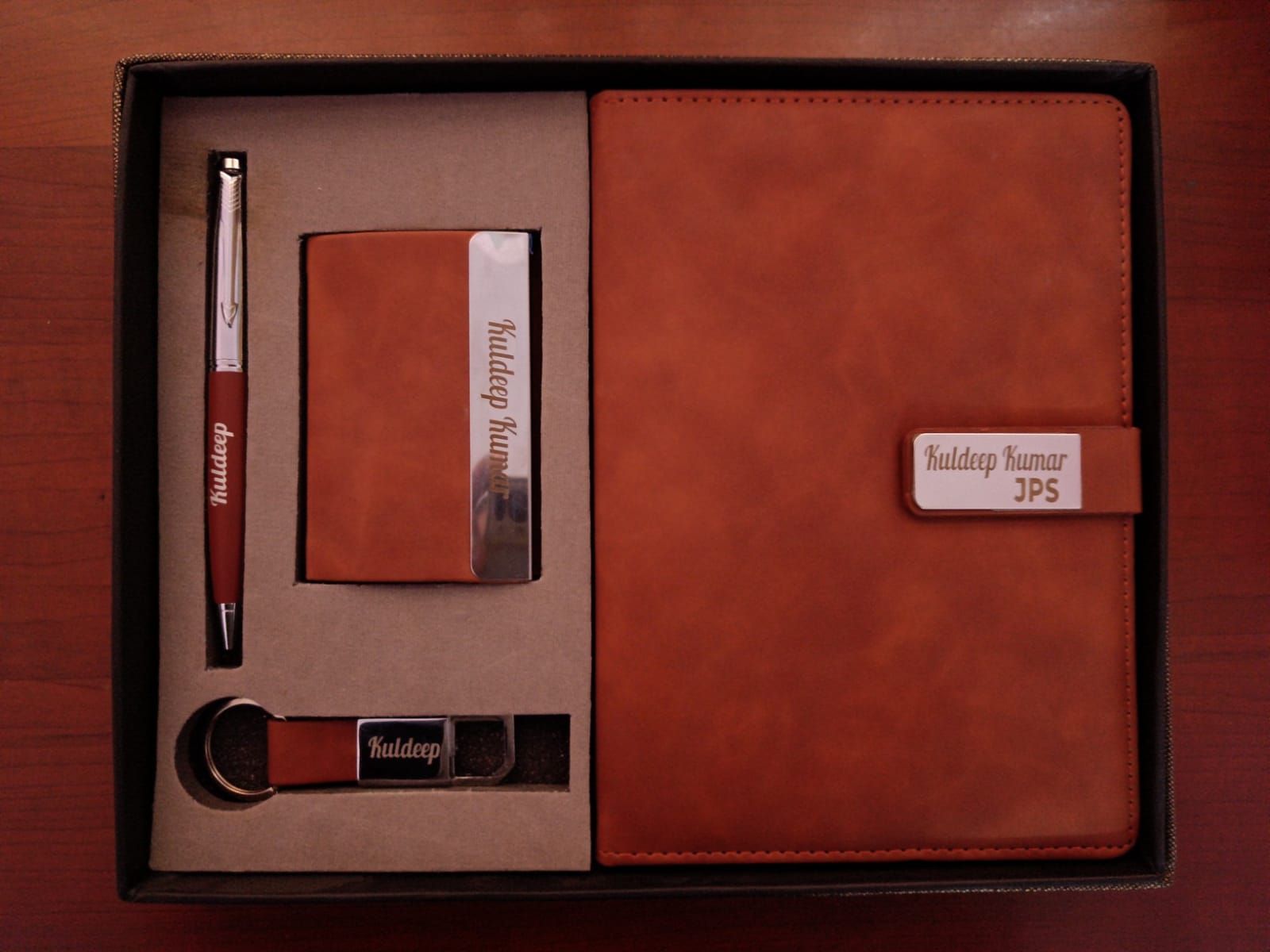 - This Combo Gift set comes with an elegant Metal Pen, Metal Hook Keychain, Visiting Card Holder and Dairy.