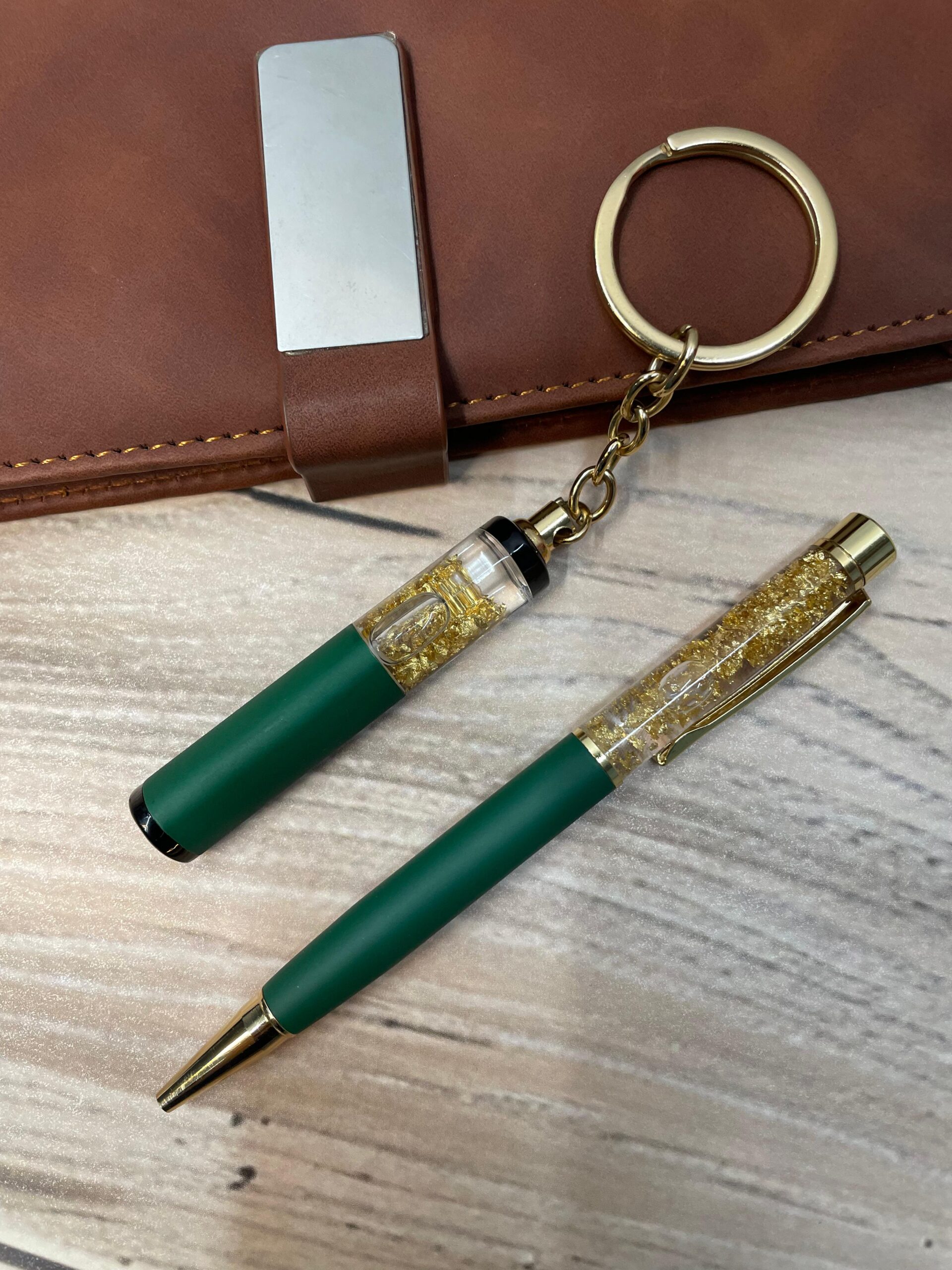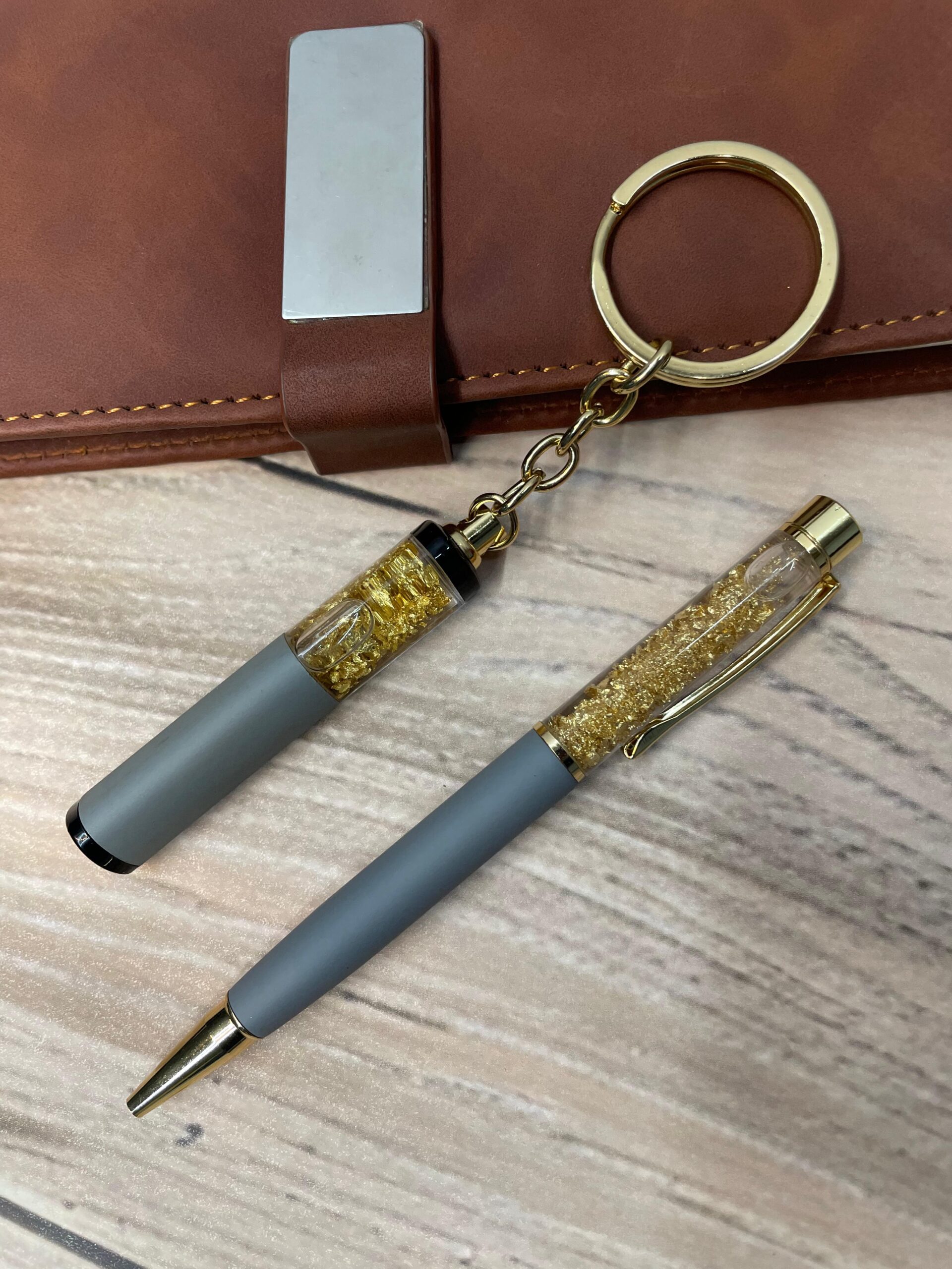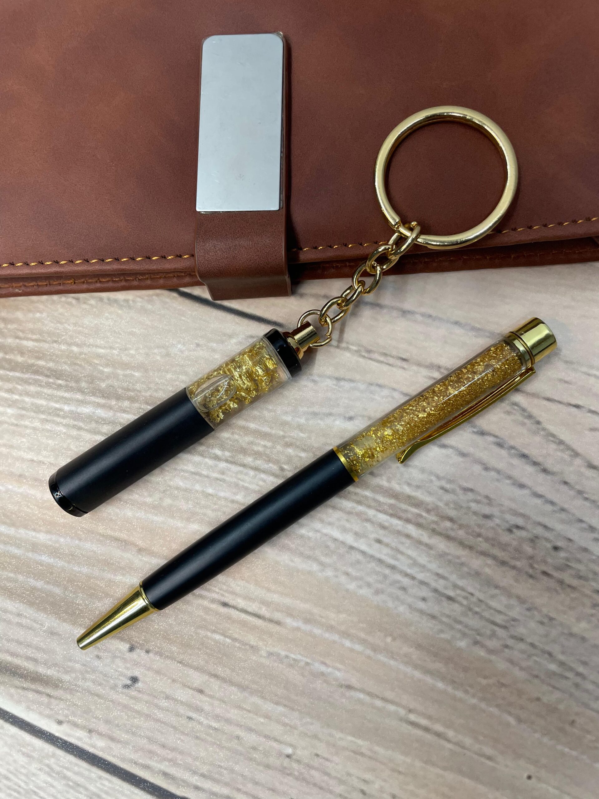 The pen writes smoothly and feels luxurious in hand, while the keychain features a stunning transparent tube with gold flakes and a sleek black insert, adding a touch of sophistication. Both items are laser-engraved with your name or custom text, making it truly one-of-a-kind.
